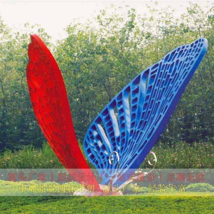 景观园林雕塑 不锈钢蝴蝶雕塑虽然现在很多城市都在建设着文明城市、文化城市,并且随着时代的发展,人们接触的新鲜事物增多,公园的环境建设也发生了改变,但是公园的环境仍然是优美的,而不锈钢蝴蝶的造型设计也是非常优美的,并且与公园优美的环境非常的相符,能够在公园优美的环境中进行较好的融入,因此,在公园中非常的盛行。